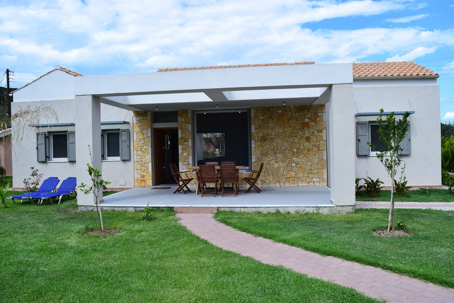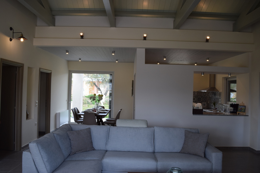 The particular feature of villa Erotas is the roof with exposed wooden beams in the living room, which are combined with shades of white and grey and create a luxurious atmosphere of relaxation and serenity.