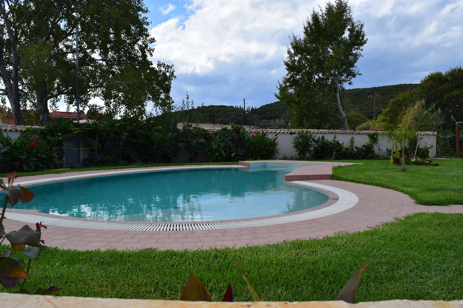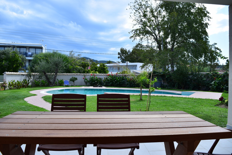 The living room leads directly to a big terrace, where you can enjoy your breakfast or a refreshing drink in front of the garden and the pool.